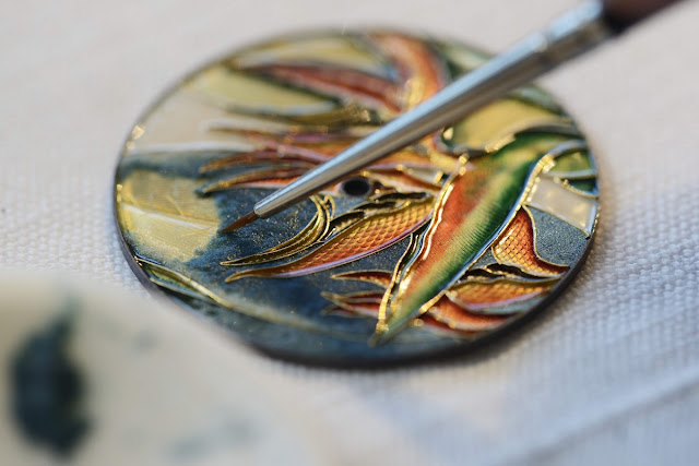 Des fils d'or fin sont soudés au cadran selon le motif, puis remplis d'émail, autrement connu sous le nom de cloisonné . L'émail est ensuite cuit dans un four, et le processus répété plusieurs fois pour obtenir les couleurs riches et variées du cadran.